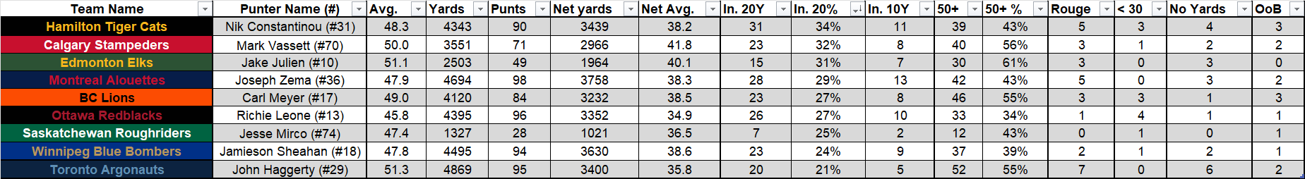 In 2025, Punters were keeping, on average, 27% of punts inside the 20 yard line. Julien had 15/49 stay inside the 20, which is 31%. The league-leader was Constantinou with 34% and the lowest was Haggerty with 21%.