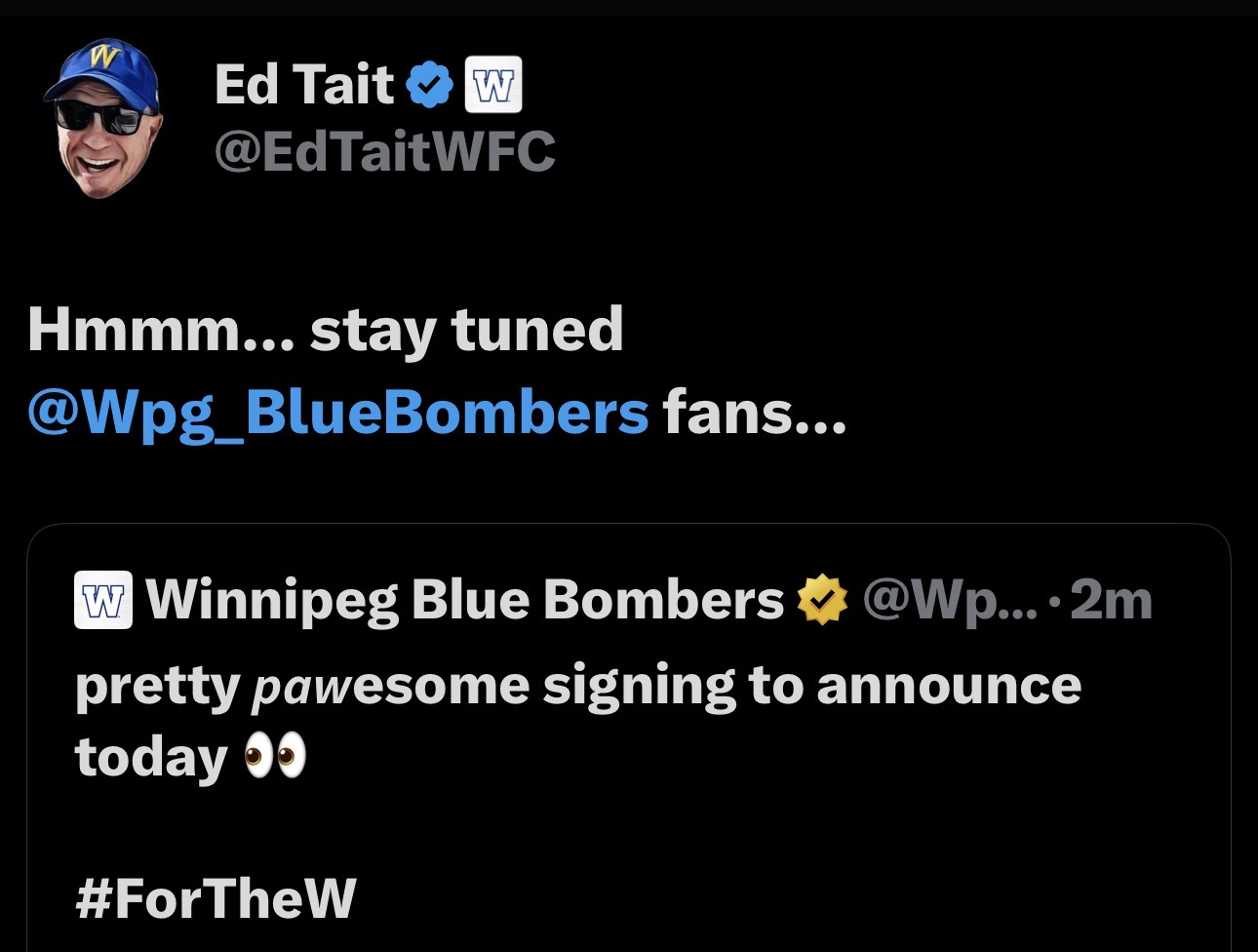 Yep, Mountain Man and Sheep-Herder Walters are back on board but so what. Its basically gonna be the same ol, same ol s on the stick in ‘26. A depleted and exhausted Zach under centre (who knows how many games he lasts before playing hero and getting TKOd into the twilight zone). An o-line that should have a SWiss cheese named for it. . . . a d-line with lots of personality but short on amplification. A defensive alignment thats Top 4 in CFL but gives up far too much yardage and T.O.P. (time of possess) plus some brutal question marks at the OC slot. Obviously, they know Jason Hogan isn’t the answer but then again, not really much to choose from in Darwin’s waiting room. O’Shea can’t take the OC headset, he’d be even worse than Hogan - Condell has a sketchy CFL history.