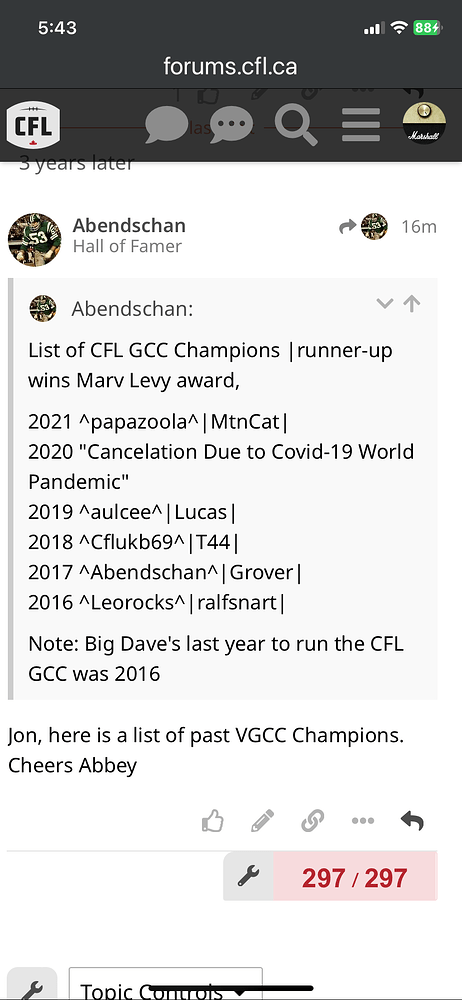 Edit: Abbey has been kind enough to provide a list of past CFL GCC pool winners as per my invitation for anyone to do so. Rather than retyping it I will provide a screenshot of Abbey’s list below. I will add the past champion names to the race for inclusion in the coveted 5 Timer’s Club. Thanks Abbey!