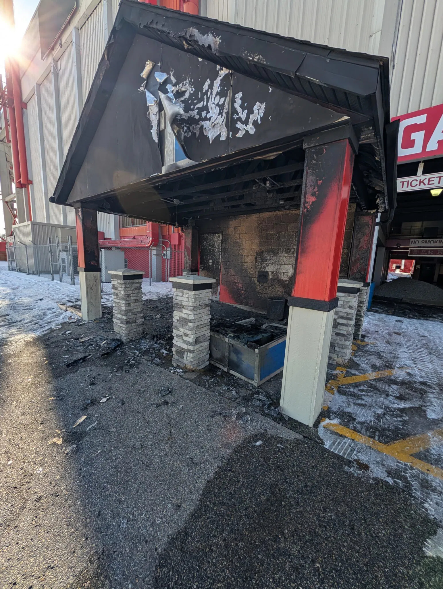 Looks like someone SET a fire at the stadium … meant to say OUTSIDE