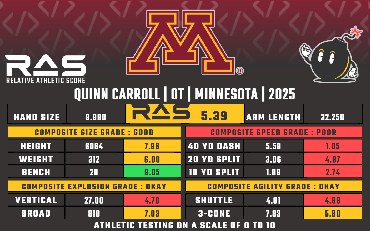 Lost in the obviously much bigger signing today was another American Tackle being added to the mix. Quinn Carroll from the 2025 draft class who just spent 3 years playing RT at Minnesota in the Big Ten after being recruited to Notre Dame as the 7th rated OT out of high school but not finding the starting lineup in 3 years there. He was honorable mention all-conference all three years. He went to rookie mini camp with the Eagles but didn’t end up signing anywhere. The blemishes that bring him up north likely are his T-rex arms at 32 1/4” which are unfortunately disqualifying for a Tackle in the NFL, being a 6th year senior, and not having enough athleticism to make up for those. Certainly an interesting guy to have a look at in camp.