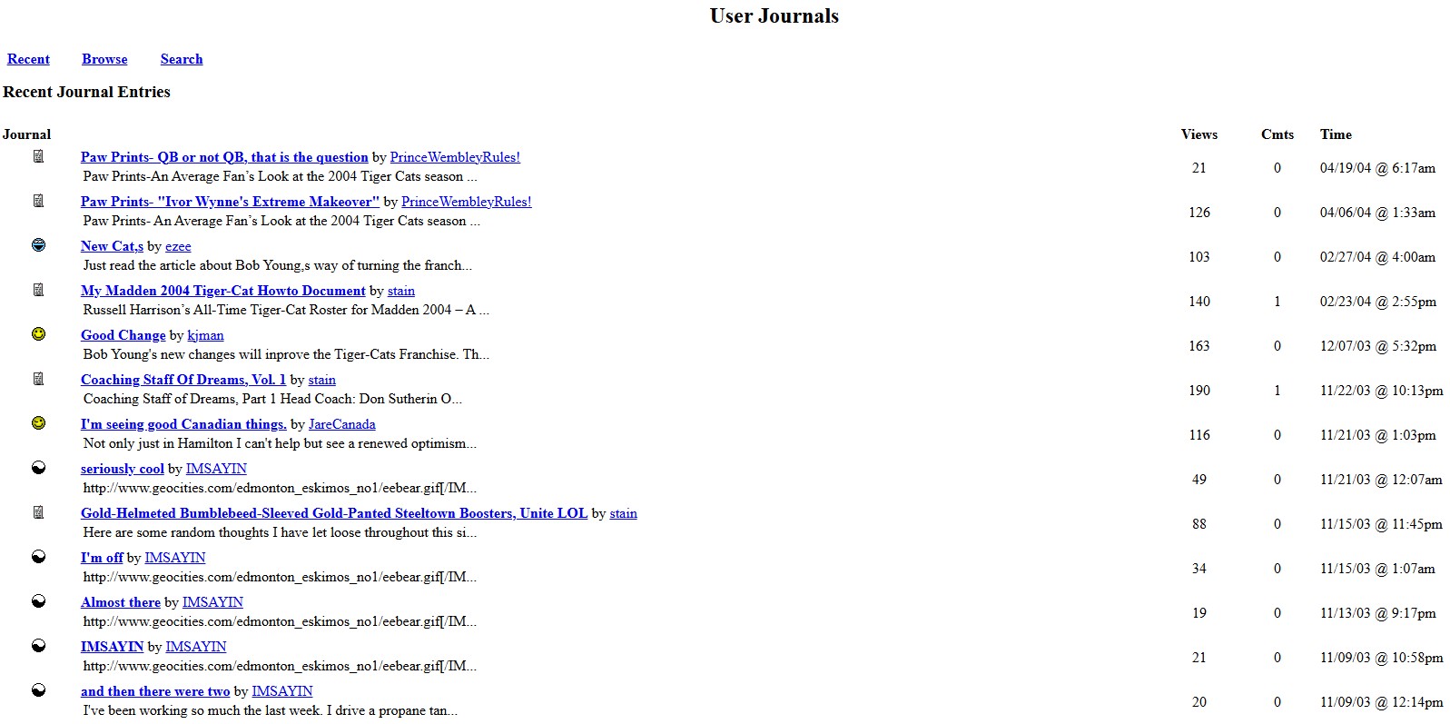 Thought you might like this screen shot of the early Ti-Cat forums. Bob Young didn’t only bring much needed $ to the league, he also brought an immense amount of technical knowledge. The Ti-Cats even had “fan journals” where we could write blog-like articles. I’ve included a screen shot of those, too.