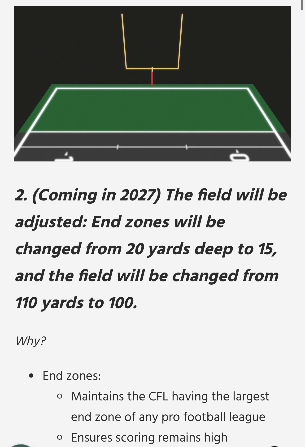 Unless I’m misunderstanding the rule, they seem to think making the end zone smaller will somehow increase the amount of touchdowns scored.