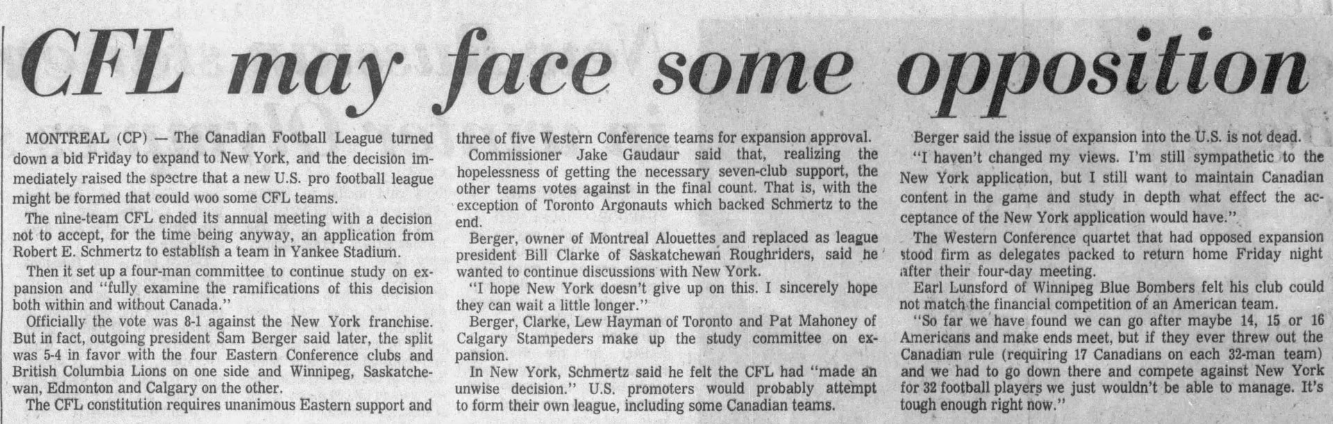 29. Notions of CFL expansion into the United States dates back to 1972 when New York real estate developer Robert Schmertz petitioned the CFL for an expansion franchise to play out of Yankee Stadium. Schmertz owned the New England Whalers of the renegade World Hockey Association (WHA) and co-owned the Boston Celtics of the National Basketball Association (NBA). Previous to that investment, however, he was a founding co-owner of the expansion Portland Traiblazers in the NBA in 1970. Schmertz threatened the CFL that if they did not grant him an expansion franchise that he would simply create his own league and put them out of business.