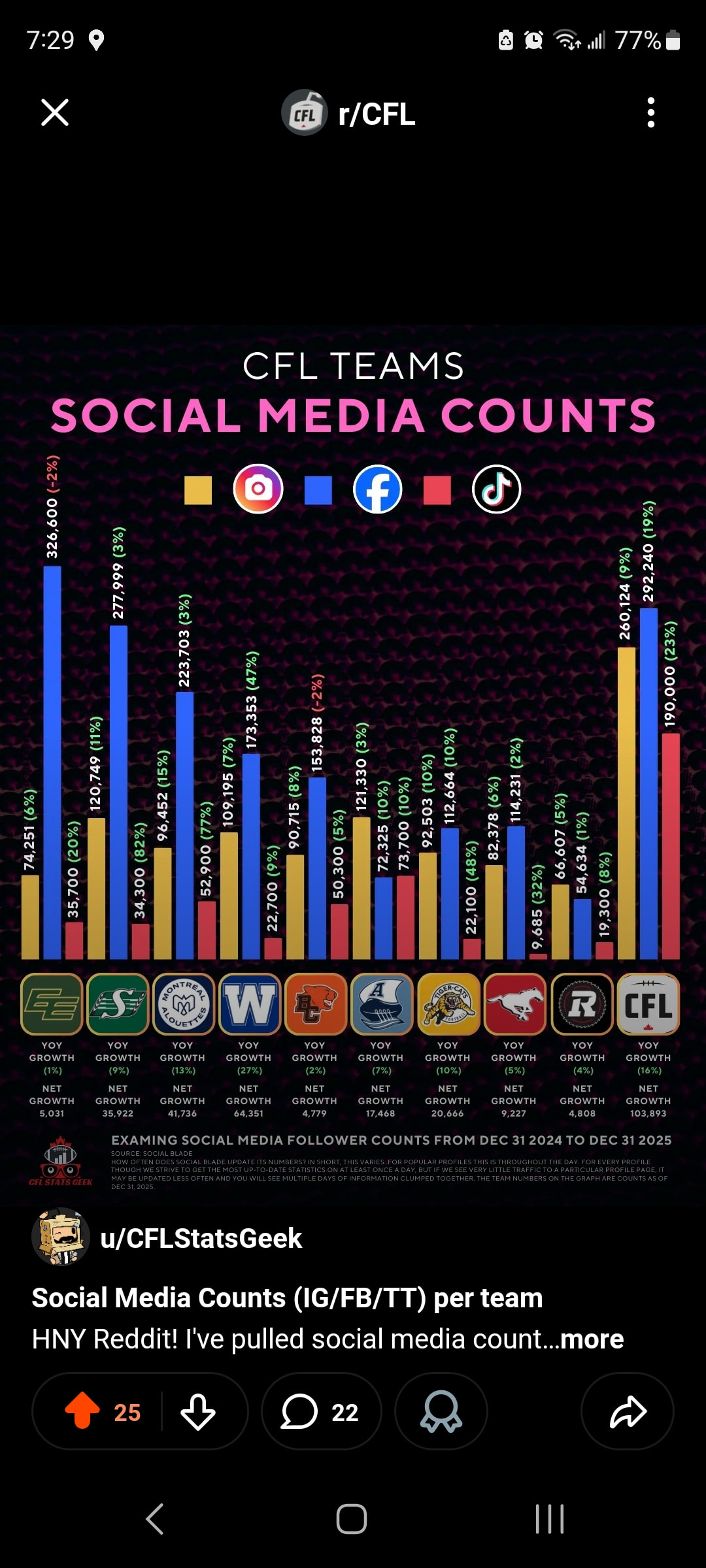 I wanted to give an update with UFL social media followers as a point of discussion. Also…here are the other teams in the CFL compliments if CFLStatsGeek at Reddit.