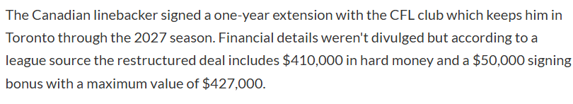 It was describing Pickett’s deal. 1 year, something like 191K. I believe it said he was the #1 paid LB in the CFL