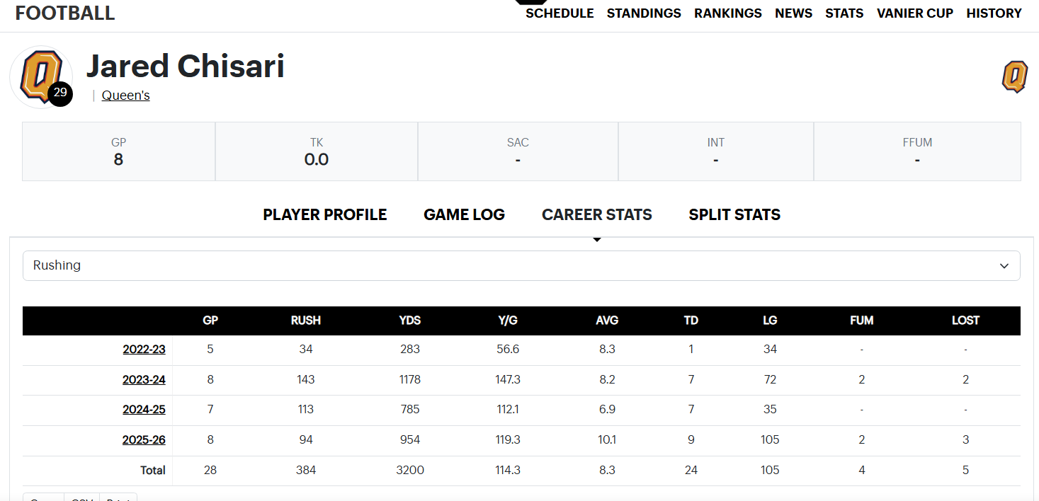 Doesn’t look like there’s going to be many decent draft eligible runningbacks from USports this year. Tough to find who’s eligible though.