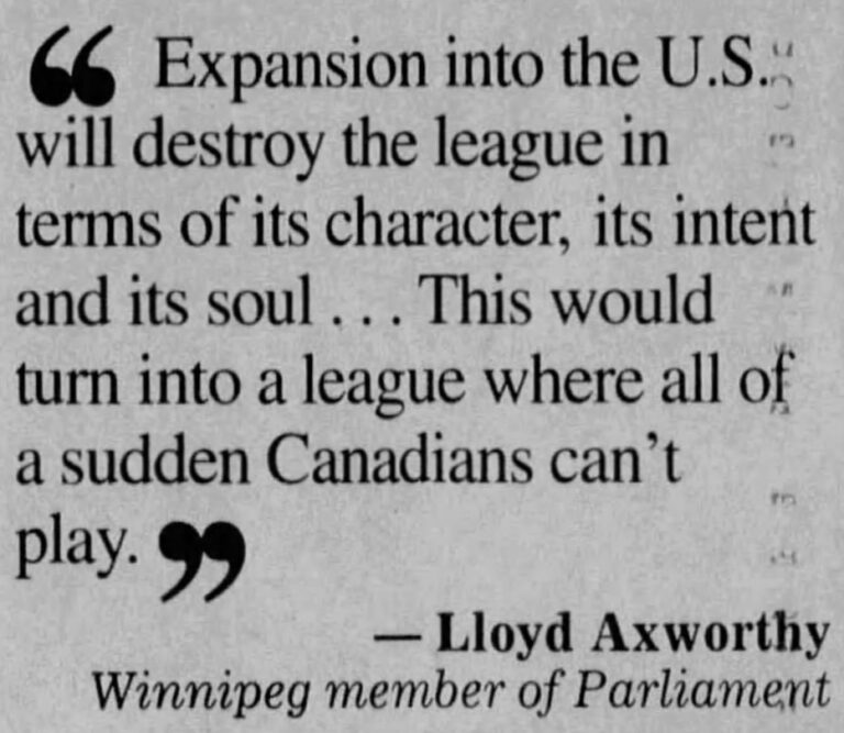 Seems, according to the other article that was posted, that Winnipeg was also against the earlier effort twenty years prior. Primary reasons, the ratio and ecconomics. Didn’t feel that the league would survive competing with the big money in the US. Had those teams managed to get strong support, they would have been correct.